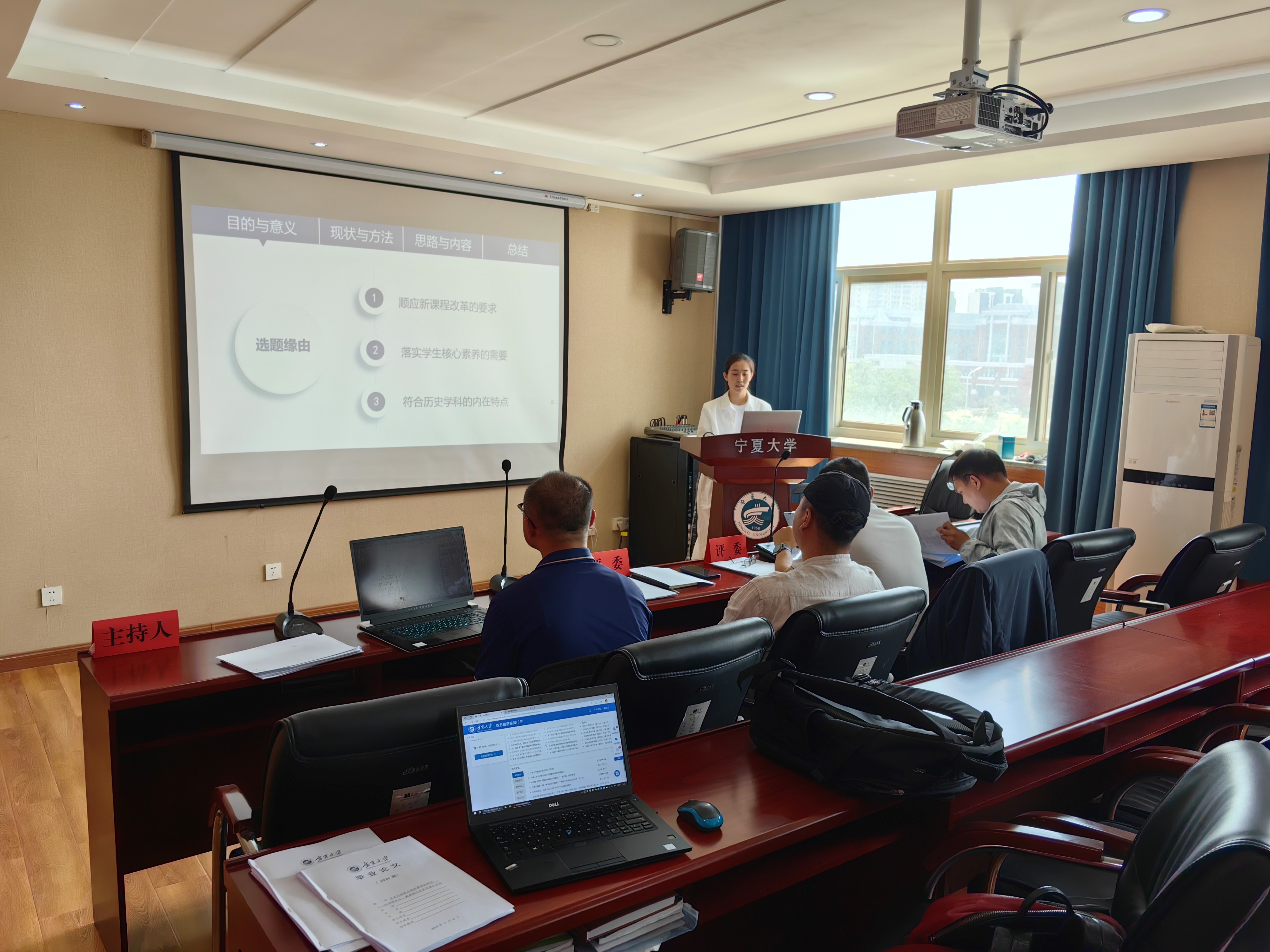 此次答辩活动围绕学生陈述、教师点评提问、学生作答三个环节展开。从选题看,学生能够立足专业,凝练方向,既有对宋元时期海商群体的探索,如陈康灵同学的《宋末元初投元海商群体的研究—以崇明朱氏、澉浦杨氏及泉州蒲氏为例》,也有对中学历史教学实践的探索,如马稚花同学的《对话式教学在中学历史教学中的运用研究——以银川市第八中学为例》,还有近代教育思想的相关论题,如何建龙同学的《梁启超学制思想研究》。