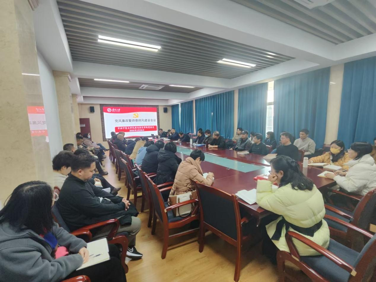 召开全面从严治党、党风廉政建设暨师德师风建设工作会议,深入学习贯彻中央和自治区关于全面从严治党最新要求,全面部署学院年度党风廉政与师德师风建设工作。会议由学院党总支书记刘杰主持,学院领导班子、全体党员及教职工参会。