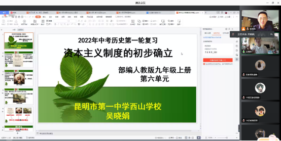 于2022年9月26日上午进行了“历史名师面对面”系列讲座第五讲。部分历史学(师范)本科生和学科教学(历史)全体研究生,参与了线上腾讯讲座。本次讲座邀请了云南昆明第一中学西山学校教学名师吴晓娟主讲,主题为“向下扎根,向阳生长——历史教学设计之我见”,活动由历史系副主任张启龙老师主持。
