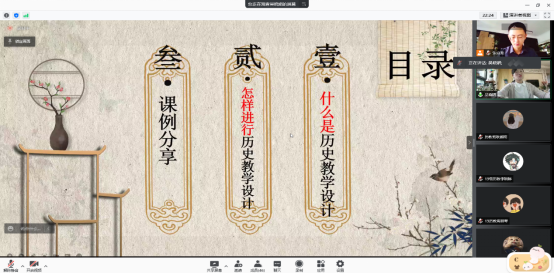 首先,吴老师向同学们分享了自己八年来的教学经验。老师提到作为一名一线的历史教学老师,最主要的是上课,那如何上好一堂好课,她认为“一堂好课不是上出来的,而是设计出来、备出来的”。吴老师在自己的教学过程中,通过精巧的教学设计,带动学生加入到课堂中来,最终可以达到好的效果。本次分享中,老师主要通过三个方面来进行,即“什么是历史教学设计,”“怎样进行历史教学设计”以及“课例分享”。