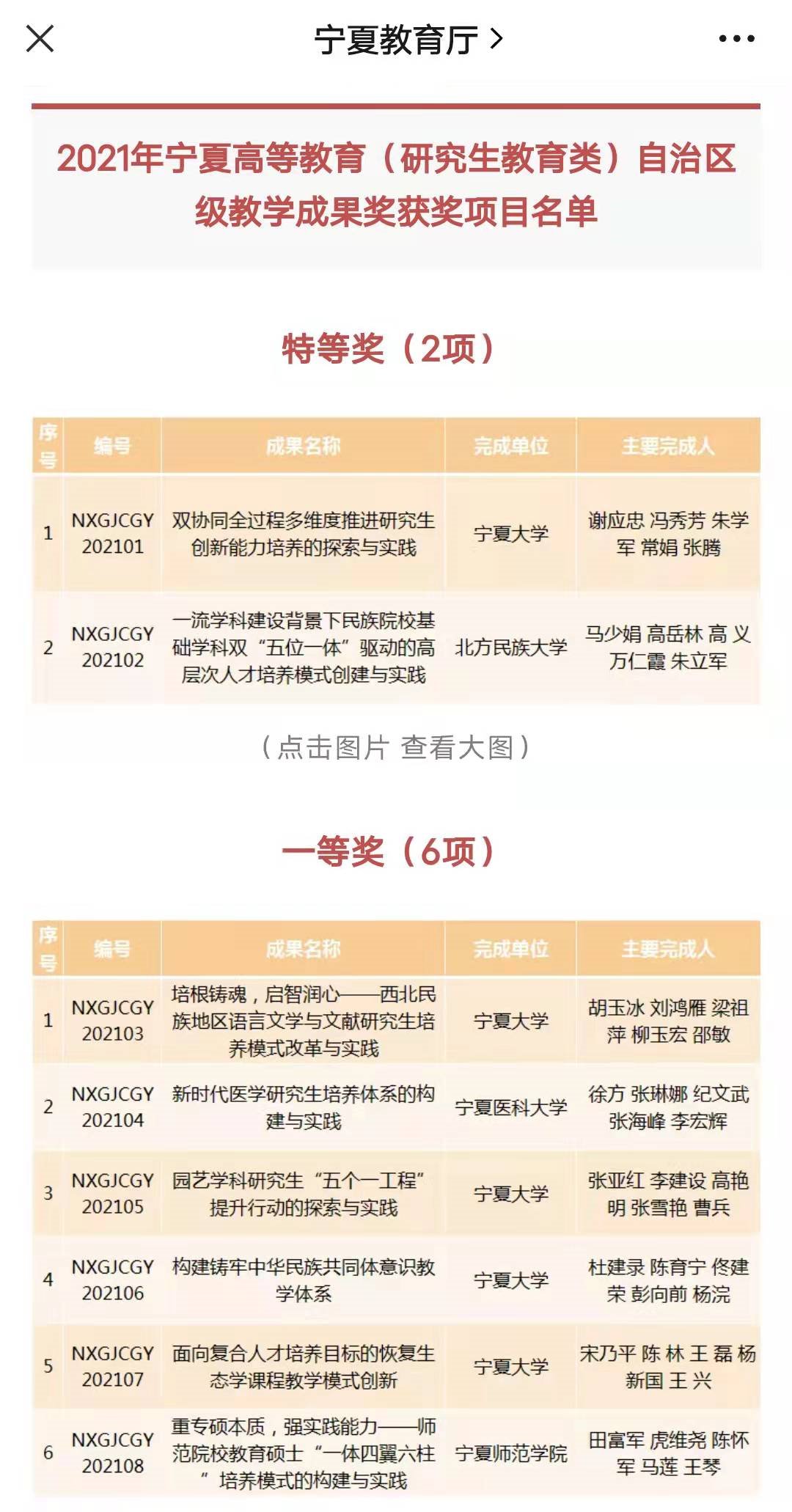 近日,自治区教育厅公布2021年高等教育自治区级教学成果奖名单。共评选出本科教育类特等奖5项、一等奖15项、二等奖30项;研究生教育类特等奖2项、一等奖6项、二等奖12项。由电子游戏 杜建录教授团队申报的《构建铸牢中华民族共同体意识教育体系》荣获研究生教育类一等奖。