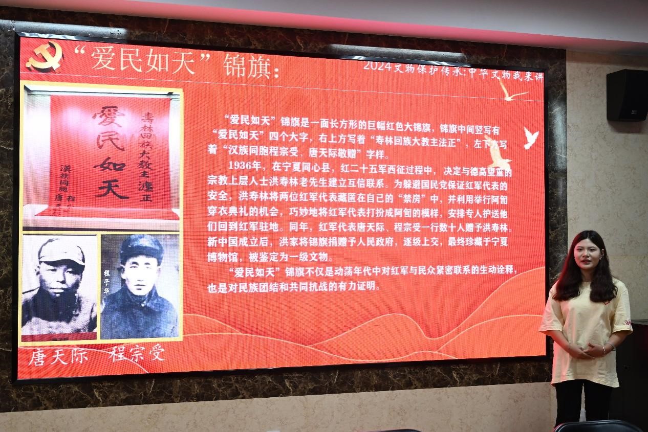星火新声•宁夏革命文物宣讲团成员分别进行了革命文物保护利用案例《盐耙耙 命根根》《情洒盐州的王贵与李香香》《“爱民如天”锦旗》《<清平乐•六盘山>手书》的宣讲展示分享。