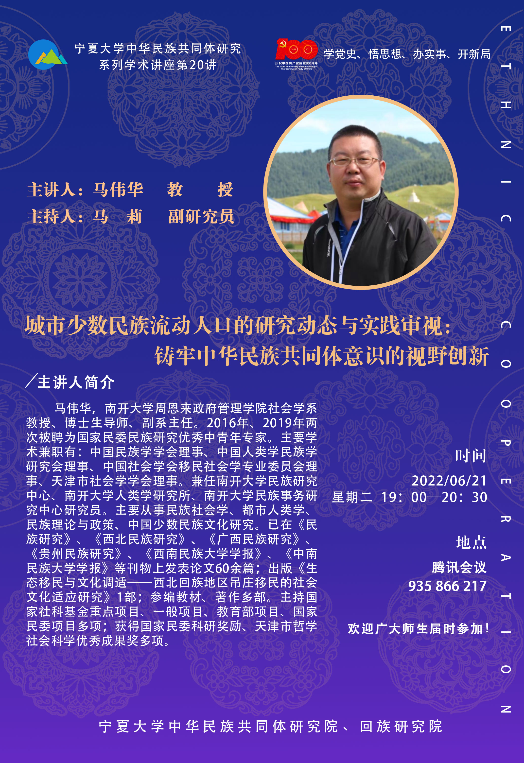 马伟华,南开大学周恩来政府管理学院社会学系教授、博士生导师、副系主任。2016年、2019年两次被聘为国家民委民族研究优秀中青年专家。主要学术兼职有:中国民族学学会理事、中国人类学民族学研究会理事、中国社会学会移民社会学专业委员会理事、天津市社会学学会理事。兼任南开大学民族研究中心、南开大学人类学研究所、南开大学民族事务研究中心研究员。主要从事民族社会学、都市人类学、民族理论与政策、中国少数民族文化研究。已在《民族研究》、《西北民族研究》、《广西民族研究》、《贵州民族研究》、《西南民族大学学报》、《中南民族大学学报》等刊物上发表论文60余篇;出版《生态移民与文化调适——西北回族地区吊庄移民的社会文化适应研究》1部;参编教材、著作多部。主持国家社科基金重点项目、一般项目、教育部项目、国家民委项目多项;获得国家民委科研奖励、天津市哲学社会科学优秀成果奖多项。